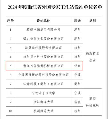 19th 12.2024 在全球化與科技創(chuàng)新的驅(qū)動(dòng)下,浙江省外國(guó)專(zhuān)家工作站成為吸引國(guó)際高端人才、推動(dòng)企業(yè)創(chuàng)新發(fā)展的重要平臺(tái)。自2020年《浙江省外國(guó)專(zhuān)家工作站管理辦法》實(shí)施以來(lái),紹興市在吸引外籍專(zhuān)家方面取得了顯著成績(jī)。截至目前,紹興市已有6家單位獲批為省級(jí)外國(guó)專(zhuān)家工作站,位居全省前列。 2024年,浙江萬(wàn)能彈簧機(jī)械有限公司榮...